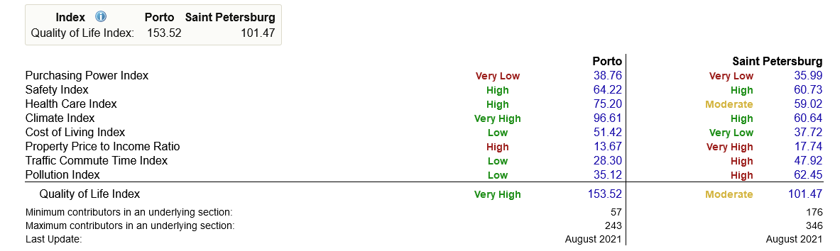 Вторые по значимости города двух стран. Арендующие жилье жители северной столицы России для поддержания одинакового с португальцами образа жизни тратят на 759€ меньше, покупательная способность ниже на 7,15% Средние расчеты потребительских цен в Питере на 28,10% ниже. Порту дороже по всем показателям: рестораны +16,02%, продукты +23,09%.